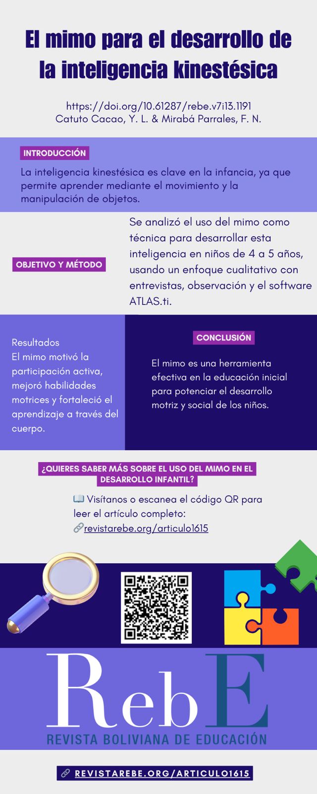Desarrollar la inteligencia kinestésica es imprescindible en la primera infancia debido a que garantiza que los infantes estudien su medio por medio de movimientos y el manejo de objetos. Este trabajo tiene como objetivo analizar al mimo y su relevancia para desarrollar la inteligencia kinestésica en niños de edades comprendidas entre los 4 y 5 años. El estudio se desarrolló utilizando un enfoque cualitativo y el método fenomenológico hermenéutico. Para recolectar información, se emplearon entrevistas semiestructuradas y se utilizó una ficha de observación; la población quedó compuesta por 30 estudiantes y una maestra de la Unidad Educativa ¨Ignacio Alvarado¨ de la Provincia de Santa Elena, Ecuador. Para el estudio de datos, se manejó el programa ATLAS.ti 24 que facilitó establecer el análisis pertinente de cada instrumento que se aplicó para esta investigación. Los hallazgos indican que implementar el mimo como técnica educativa contribuye significativamente al perfeccionamiento de la inteligencia kinestésica debido a que promueve la cooperación activa de los niños en las actividades docentes y mejora diversas habilidades motrices esenciales para su desarrollo integral. Se concluye que el mimo favorece el desarrollo de la inteligencia kinestésica durante la interacción social y cultural, lo cual constituye un elemento clave para adquirir habilidades motrices en los niños de la educación inicial.