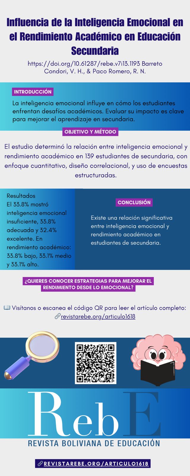 The objective of this research was to determine the influence of emotional intelligence on academic performance among secondary education students. The study was conducted under a quantitative, non-experimental, cross-sectional, and correlational design. The sample consisted of 139 students, estimated for a 95% confidence level and a 5% margin of error. Structured surveys were used as the data collection technique, employing the Emotional Intelligence Scale (TMMS-24) and the Academic Performance Perception Scale as instruments. The general results of the Emotional Intelligence Scale indicate that 33.8% of respondents had an insufficient level of emotional intelligence, 33.8% were classified as adequate, and 32.4% achieved an excellent level. Regarding the Academic Performance Perception Scale, 33.8% of participants perceived their academic performance as low, 33.1% as medium, and 33.1% as high. This study confirms that emotional intelligence plays a significant role in the academic performance of secondary school students. It is concluded that emotional intelligence plays a relevant role in the academic performance of high school students.